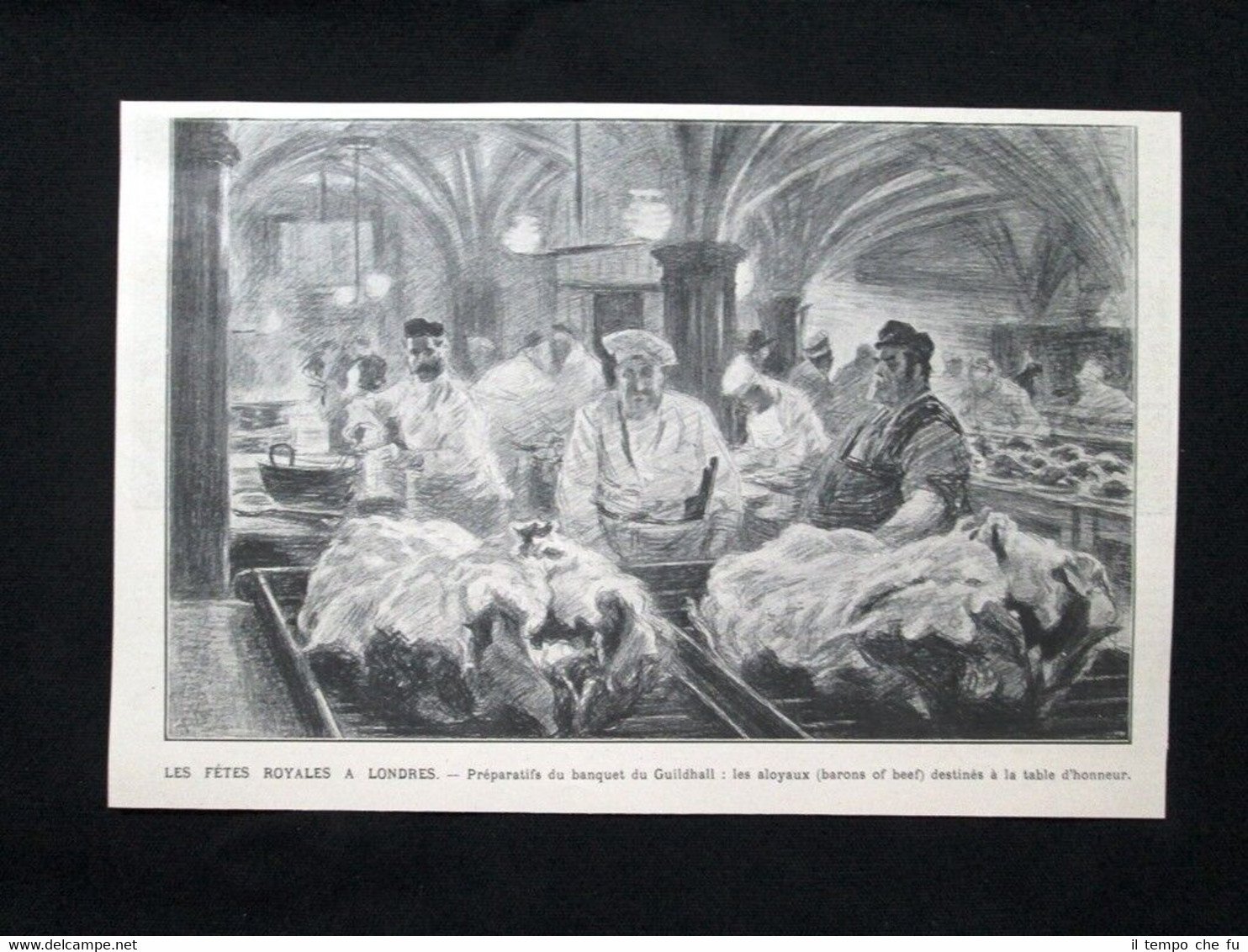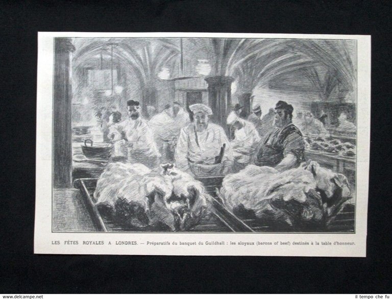 Rara stampa estratta da pubblicazione del 1902. .stampa che ha quindi oltre 116 anni! Celebrazioni reali a Londra - Preparativi per il banchetto al Municipio: le lombate (baroni di manzo) per il tavolo principale Dimensioni Cm 24,00 x 16,00 Illustration 1902 - 16 Qualora vogliate delle scansioni migliori contattateci, soddisferemo ogni vostra richiesta. Paypal Carta di credito Bonifico bancario Accuratamente adagiate su un cartoncino e protette da pellicola trasparente rigida, il tutto viene inserito dentro plico di adeguate dimensioni per proteggerne l'integrità.