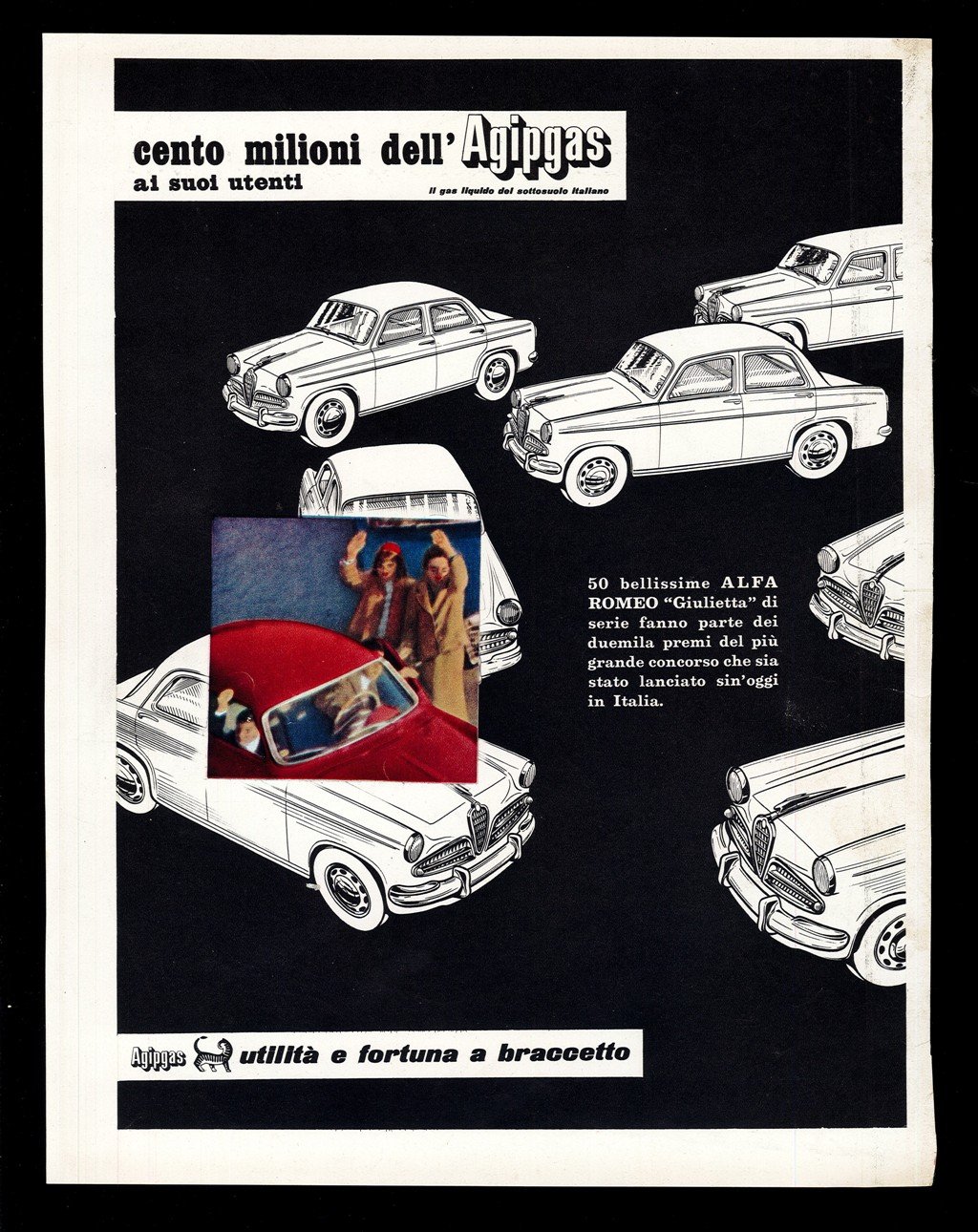 Autore: Mondadori. Luogo: Milano. Anno: [1955]. Tecnica: offset. Dimensioni: 32x25. Conservazione: buone. Foglio sciolto tratto da periodico anni '50, pagina pubblicitaria Agip