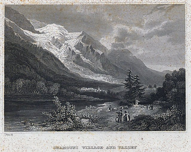 Stampa antica ed originale con veduta del paese di Chamouni e sullo sfondo il Bianco, variante alla n° 1214