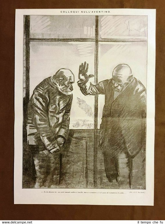 Rara stampa estratta da pubblicazione del 1925. .stampa che ha quindi oltre 95 anni! Colloqui sull'Aventino "Te lo dicevo io: Su certi certi monti salire è facile, ma a scendere c'è il caso di rompersi il collo…" Disegno di E. Sacchetti Codice articolo: II1925-007 Dimensioni Cm 26,00 x 37,00 Paypal Carta di credito Bonifico bancario Spedizione con posta ordinaria o raccomandata scelta dall'Acquirente nel momento del pagamento Clicca qui per accedere al nostro Store ed al suo sterminato archivio