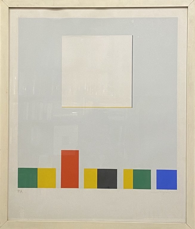 Litografia a 9 colori, composizione astratta. Firmato a matita in basso a destra, a matita in basso a sinistra P.A. Nel margine inferiore bianco timbro a secco raffigurante due caratteri cinesi. L'opera è montata in cornice bianca e proviene dagli eredi del pittore Gianni Dova.
