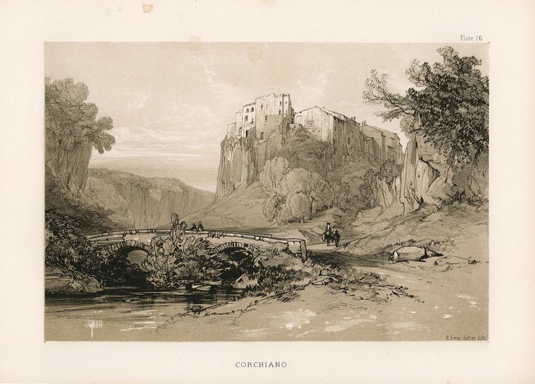Veduta della cittadina, antica ed originale, stampata su fondino seppia. Inserita nel primo volume dell’opera “Illustrated excursions in Italy by Edward Lear” London: Thomas M’Lean, 26, Haymarket M.DCCC.XLVI.