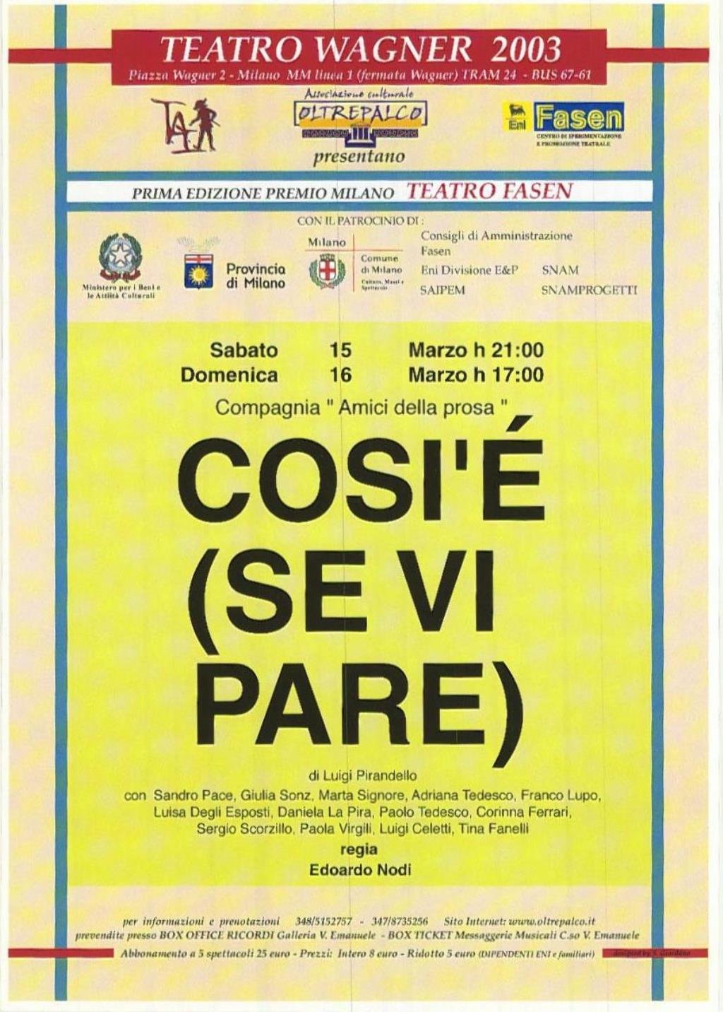 Opera di Luigi Pirandello, Prima edizione Premio Milano Teatro Fasen, Teatro Wagner, Compagnia Amici della Prosa, regia Edoardo Nodi. Designed by S. Giordano. Locandina in ottime condizioni
