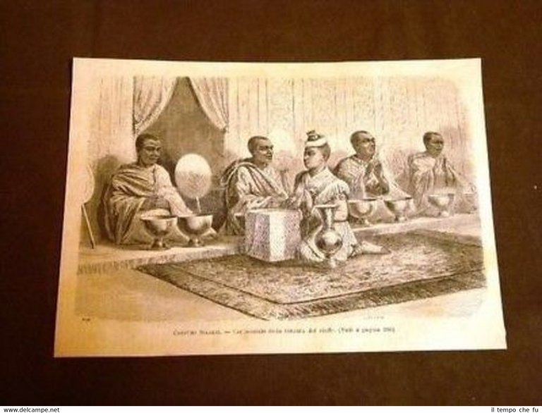 RARA INCISIONE OTTOCENTESCA ESTRATTA DA RIVISTA D'EPOCA Costumi Siamesi Cerimonia della Tonsura del ciuffo Siam II1873-026T Dimensioni Cm 25,50 x Cm 18,50 Qualora vogliate delle scansioni migliori contattateci, soddisferemo ogni vostra richiesta. Paypal Carta di credito Bonifico bancario Accuratamente adagiate su un cartoncino e protette da pellicola trasparente rigida il tutto viene inserito dentro plico di adeguate dimensioni per proteggerne l'integrità