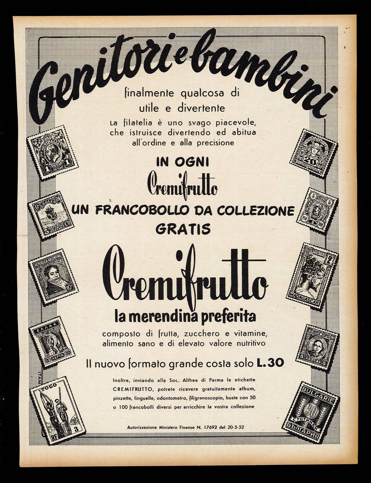 Autore: n.d. Luogo: n.d. Anno: [1960]. Tecnica: offset. Dimensioni: 32x25. Conservazione: buone. Foglio sciolto tratto da periodico anni '60, pagina pubblicitaria Cremifrutto