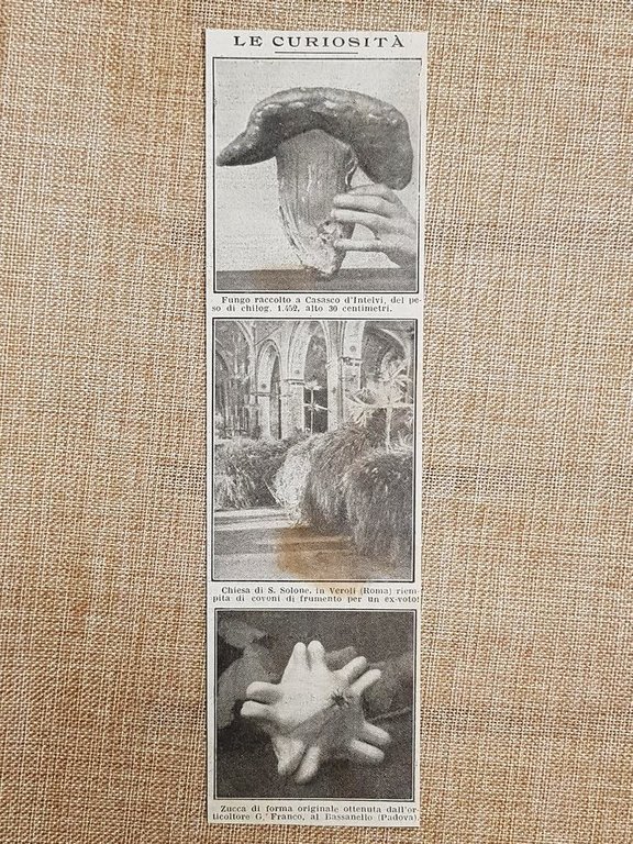 Curiosità 1914 Fungo a Casasco d'Intelvi Chiesa S.Solone Veroli Zucca Bassanello Rara stampa estratta da pubblicazione del 1914 Curiosità del 1914 Fungo di 1,452 kg e alto 30 cm raccolto a Casasco d'Intelvi Chiesa di San Solone riempita di covoni di frumento a Veroli Zucca ottenuta dall'agricoltore G. Franco a Bassanello (Padova) Codice prodotto: VIP-181 Dimensioni Cm 6,00 x 21,00