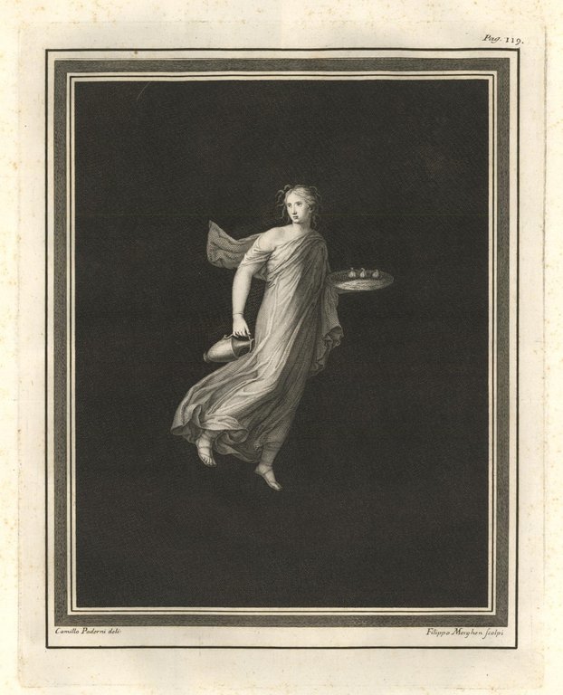 Incisione raffigurante danzatrice facente parte delle dodici pitture ritrovate negli scavi del 18 gennaio 1749 in Torre Annunziata in un luogo detto Civita. Tratta dal tomo primo della monumentale opera "Le Pitture antiche d'Ercolano e contorni incise con qualche spiegazione", sontuosamente illustrata da diversi artisti tra i quali: Giuseppe Aloja, Nicola Billi, Pietro Campana, Nicola Cesarano, P. Gaultier, Francesco Martano, Filippo Morghen, Camillo Paderni, Rocco Pozzi, N. Ricci, Nicola Vanni, Francisco de Vega. Edita a Napoli dalla Regia Stamperia nel 1757. Autore: Paderni Camillus & Filippo Morghen sculp. - Regia Stamperia edit. Luogo: Torre Annunziata - Pitture. Anno: 1757. Tecnica: incisione in rame. Dimensioni: mm 288x224 - 470x340 il foglio