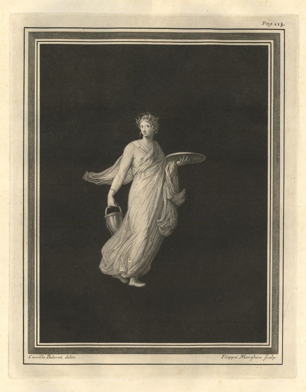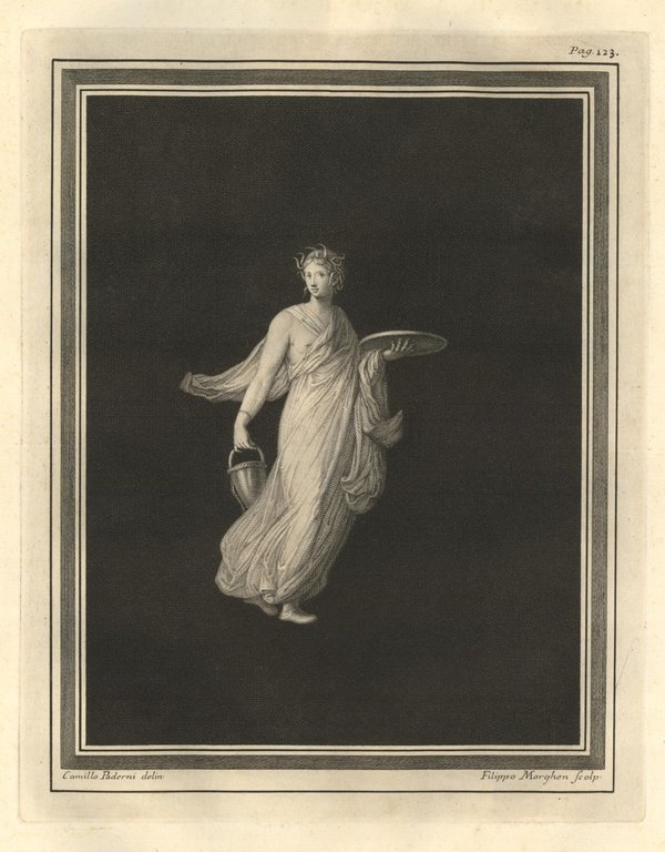 Incisione raffigurante danzatrice facente parte delle dodici pitture ritrovate negli scavi del 18 gennaio 1749 in Torre Annunziata in un luogo detto Civita. Tratta dal tomo primo della monumentale opera "Le Pitture antiche d'Ercolano e contorni incise con qualche spiegazione", sontuosamente illustrata da diversi artisti tra i quali: Giuseppe Aloja, Nicola Billi, Pietro Campana, Nicola Cesarano, P. Gaultier, Francesco Martano, Filippo Morghen, Camillo Paderni, Rocco Pozzi, N. Ricci, Nicola Vanni, Francisco de Vega. Edita a Napoli dalla Regia Stamperia nel 1757. Autore: Paderni Camillus & Filippo Morghen sculp. - Regia Stamperia edit. Luogo: Torre Annunziata - Pitture. Anno: 1757. Tecnica: incisione in rame. Dimensioni: mm 295x227 - 470x340 il foglio