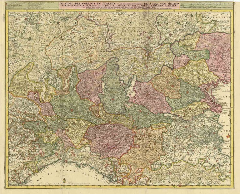 DE STOEL DES OORLOGS IN ITALIEN, WAAR IN VERTOONT WERDEN DE STAAT VAN MILANO, DE REPUBLICEN VAN VENETIEN EN GENOVA, DE LANDEN VAN PARMA, MANTOVA, MODENA, FERRARA, EN ANDERE MET HAARE GRENSEN.