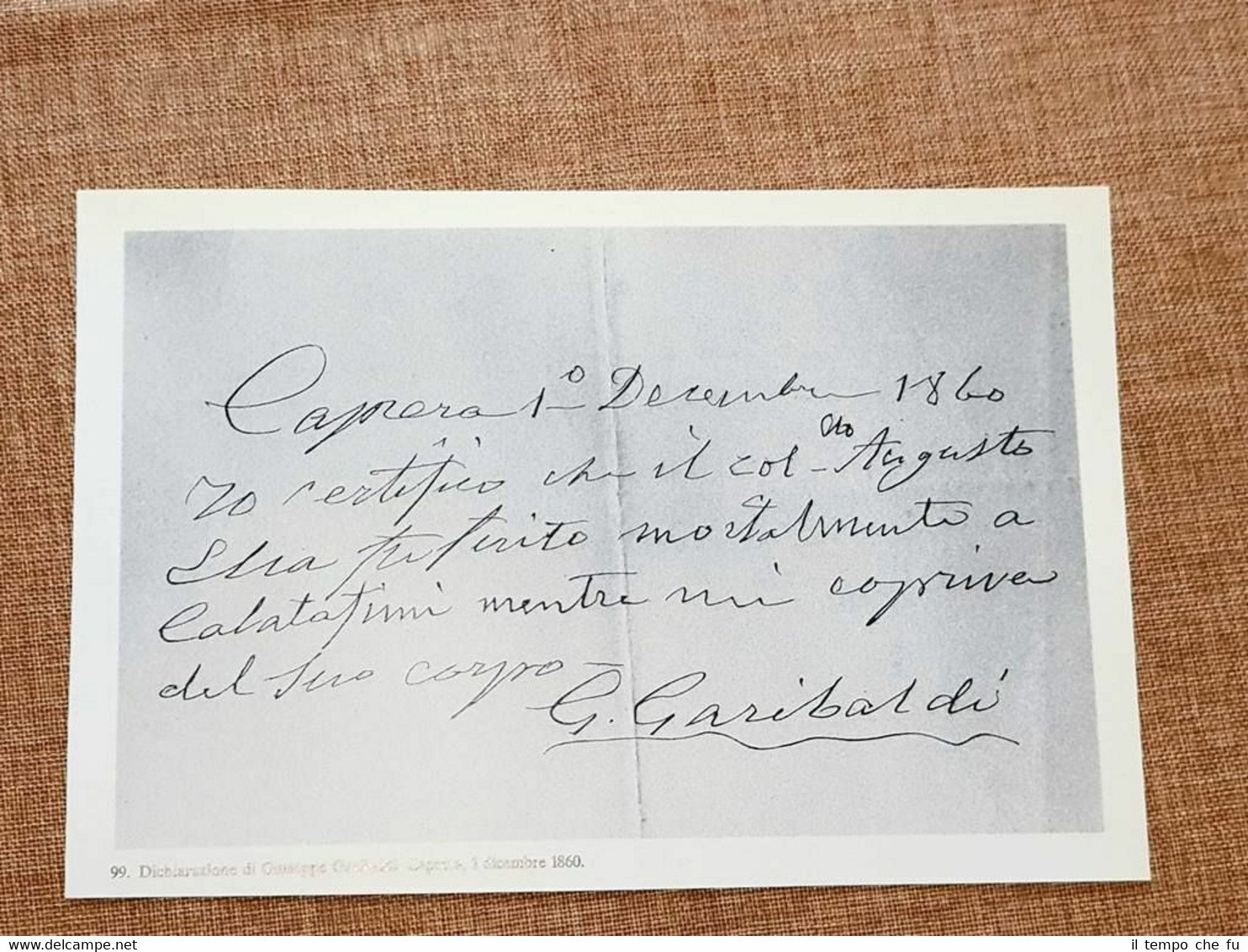 Rara stampa estratta da pubblicazione della fine del '900 Dichiarazione di Giuseppe Garibaldi dell'1 dicembre 1860 Ferimento di Augusto Elia Dimensioni: Cm 23,00 x 16,00 Codice prodotto: II1897-053 Qualora vogliate delle scansioni migliori contattateci, soddisferemo ogni vostra richiesta. Paypal Carta di credito Bonifico bancario Accuratamente adagiate su un cartoncino e protette da pellicola trasparente rigida, il tutto viene inserito dentro plico di adeguate dimensioni per proteggerne l'integrità.