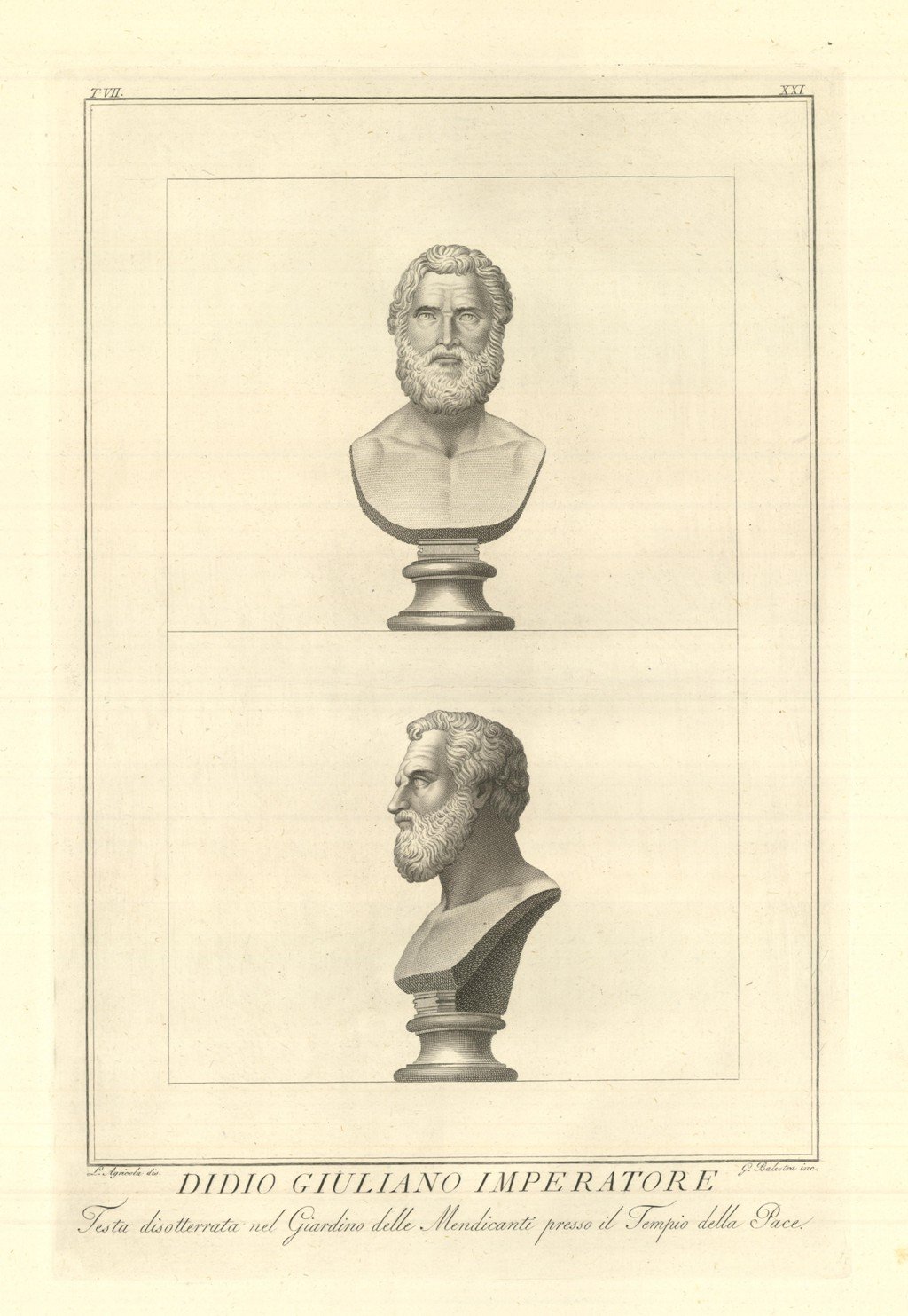 DIDIO GIULIANO IMPERATORE / Testa disotterrata nel Giardino delle Mendicanti presso il Tempio della Pace | Prints | Agricola dis. & Balestra inc.