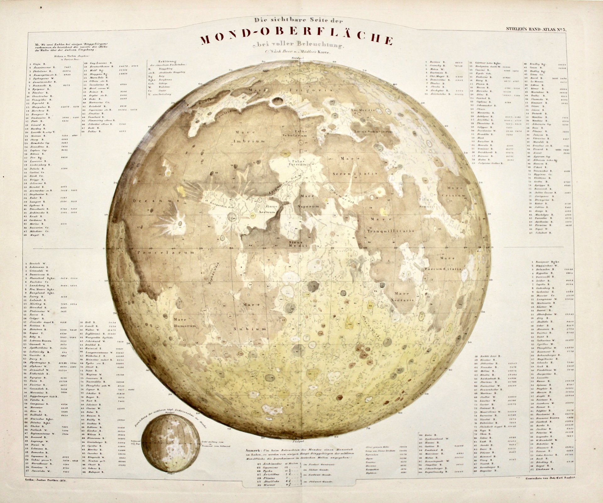 Incisione di Johann Carl Ausfeld, mm 350x430, colore d’epoca a stampa con finitura posteriore a mano. Tratta da Hand-Atlas. Bella carta che evidenzia il suolo lunare. Perfettamente conservata.