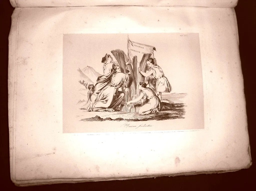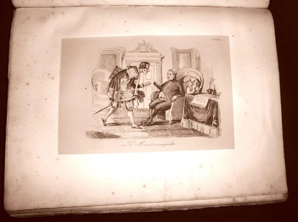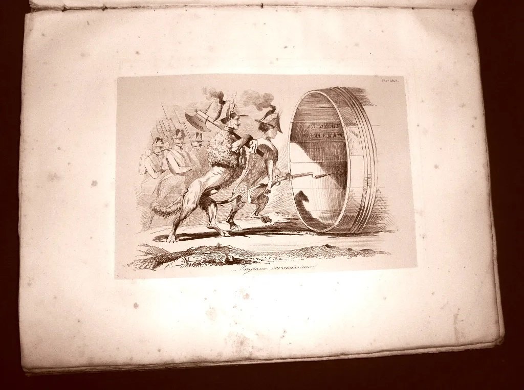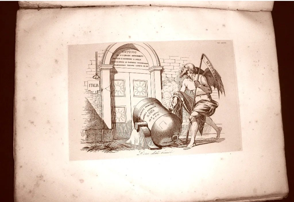 Opera assai rara e ricercata "Don Pirlone a Roma. Memorie di un Italiano dal 1° settembre 1848 al 31 dicembre 1850" Tre volumi in 4°, cm. 34,00 x cm. 26,00 pagine 216 + 100 tavole, 208 + 100 tavole e 220 + 106 tavole. Antiporta illustrata a ciascun volume. Opera completa di tutte le sue pagine e presenti tutte le meravigliose 306 tavole allegorico - caricaturali fuori testo. Legatura originale in cart. rigido a stampa con vignette impresse a ciascun piatto anteriore, dorsi rinforzati anticamente in carta. Presente timbro di una biblioteca dell'immigrazione alle antiporte, fioriture marginali. Complessivamente esemplare genuino e marginoso che possiede la particolarità di avere le tavole stampate su carta di Cina ed applicate, onde evitarne la fioritura, e di averle tutte presenti. Celebre opera di dissacrante satira politica, soprattutto contro il Papato, la Francia e l'Austria, le cui tavole provengono prevalentemente dal giornale romano Don Pirlone, quotidiano apparso nel 1848 e 1849. Autore: Michelangelo Pinto Editore: Alessandro Fontana Anno di pubblicazione: 1850, seconda edizione. Opera completa I moti del 1848, detti anche rivoluzione del '48 o Primavera dei popoli furono un'ondata di moti rivoluzionari borghesi che sconvolsero l'Europa nel 1848 e nel 1849. Scopo dei moti fu abbattere i governi della Restaurazione per sostituirli con governi liberali. Il loro impatto storico fu così profondo e violento che nel linguaggio corrente è entrata in uso l'espressione «fare un quarantotto» per sottintendere una improvvisa confusione e scompiglio. La prima agitazione europea del 1848 si verificò in Italia: la rivoluzione siciliana che esplose il 12 gennaio di quell'anno, che rappresentò la prima miccia dell'esplosione europea. L'insurrezione siciliana, infatti, spinse in un primo momento i Borbone a concedere il ritorno nell'Isola alla costituzione del 1812. Seguì una rivoluzione a Napoli, il 27, che costrinse, due giorni dopo, Ferdinando II a promettere una Costituzione, promulgata l'11 febbraio. Lo stesso 11 febbraio Leopoldo II di Toscana, cugino primo dell'imperatore Ferdinando I d'Austria, concesse la Costituzione, nella generale approvazione dei suoi sudditi. L'esempio borbonico fu seguito da Carlo Alberto di Savoia con lo Statuto Albertino e da Papa Pio IX con lo Statuto Fondamentale. Solo il re piemontese mantenne però lo Statuto. In Sicilia il parlamento proclamò in marzo l'indipendenza, che sarebbe durata fino al maggio 1849. Nel napoletano la concessione e la successiva repressione delle libertà costituzionali, portò dal maggio al settembre di quell'anno a una serie di moti. In tutto il Regno Lombardo-Veneto scoppiarono rivolte, come le Cinque giornate di Milano che sfociarono nella prima guerra di indipendenza. Nello Stato Pontificio una rivolta interna estromise papa Pio IX dai suoi poteri temporali e portò alla costituzione della Repubblica Romana. La rivoluzione delle Cinque giornate di Milano e altre proteste indussero il Re Carlo Alberto a dichiarare guerra all'Austria. Le truppe vennero presto sconfitte e solo quelle francesi poterono far retrocedere gli austriaci. La successiva ascesa al trono di Vittorio Emanuele II fece del Piemonte il motore propulsore del processo di unificazione italiana che tuttavia si sarebbe ottenuto solo nel 1861. Per quanto i Moti del '48 furono sedati abbastanza velocemente, le vittime furono decine di migliaia: il destino della democrazia europea ci è sfuggito di mano dichiarerà Pierre-Joseph Proudhon. Gli storici concordano che la Primavera dei popoli fu, alla fin fine, soprattutto un sanguinoso fallimento, se si eccettua la concessione dello Statuto Albertino nel Regno di Sardegna da parte di Carlo Alberto di Savoia, l'unica costituzione non revocata di quelle concesse o votate nel 1848-49. Vi furono tuttavia radicali e notevoli effetti a lungo termine: Germania e Italia sarebbero presto arrivate all'unificazione facendo leva anche sulla necessità di autodeterminazione dei popoli. Analogamente l'Ungheria sarebbe giunta ad un parziale riconoscimento della propria autonomia (a discapito della popolazione slava) grazie all'Ausgleich del 1867. In Prussia e Austria fu abolito il feudalesimo, mentre in Russia fu eliminata la servitù della gleba nel 1861. L'Opera vanta 306 tavole allegorico - caricaturali sullo stato dell'Italia del tempo, incisione su rame ricca di significato e rappresentazione mediante satirica dissacrante della condizione della nostra penisola oppressa. Le tavole furono in parte riprese dal giornale romano Don Pirlone, quotidiano, uscito dal 1settembre 1848 al 2 luglio 1849 (con una interruzione dl 29 aprile al 7 maggio 1849), ma in parte furono realizzate appositamente per questa opera. Tra gli incisori sono presenti anche i nomi di Ratti, Vaiani, Monneret, Gallucci, Pichi, Masutti. Il titolo Don Pirlone deriva quasi sicuramente da una maschera creata dallo scrittore satirico Girolamo Gigli (1660 - 1722).