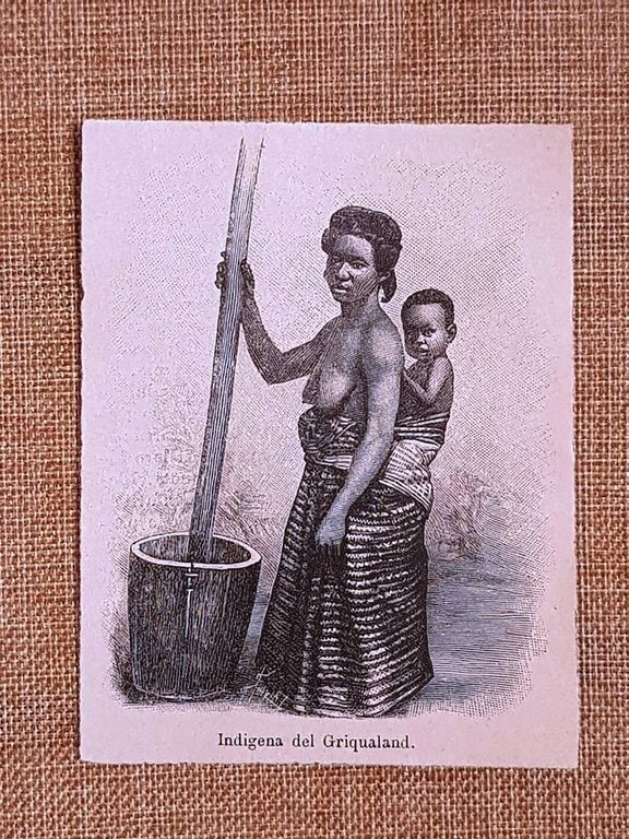 Rara stampa Estratta da pubblicazione del 1899 Una donna indigena del Griqualand, regione dell’attuale Sudafrica, con il proprio bambino. L’immagine documenta un momento di vita quotidiana, offrendo uno sguardo diretto sulla cultura materiale e sull’abbigliamento tradizionale dell’epoca. La donna, appartenente alla popolazione locale – in gran parte composta da Griqua e da altri gruppi indigeni – è raffigurata in posa semplice ma dignitosa, con il piccolo tenuto vicino a sé, simbolo del legame materno e della continuità della comunità. Dimensioni: Cm 8,00 x 10,00 Codice prodotto NEDA-123 PayPal Carta di credito Bonifico bancario Inserita dentro plico di adeguate dimensioni per proteggerne l'integrità Spedizione con posta ordinaria o raccomandata scelta dall’Acquirente nel momento del pagamento Clicca qui per accedere al nostro Store ed al suo sterminato archivio