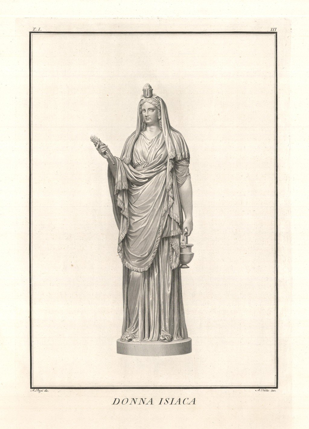 Incisione raffigurante una sacerdotessa nelle vesti di Iside inserita nel tomo primo dell'opera "Il Museo Chiaramonti aggiunto al Pio-Clementino da N. S. Pio VII P. N." Pubblicata da Antonio d'Este e Gaspare Capparone a Roma nel 1808. La statua, avvenente e di nobile portamento, indossa una tuniche dalle sottilissime pieghe e un elegante manto con frange che avvolge la testa e copre le spalle. I due fiori di loto rappresentano la divinità. Autore: Pozzi A. dis. & Testa A. inc. Luogo: Iside. Anno: 1808. Tecnica: incisione in rame. Dimensioni: 620x430 il foglio.