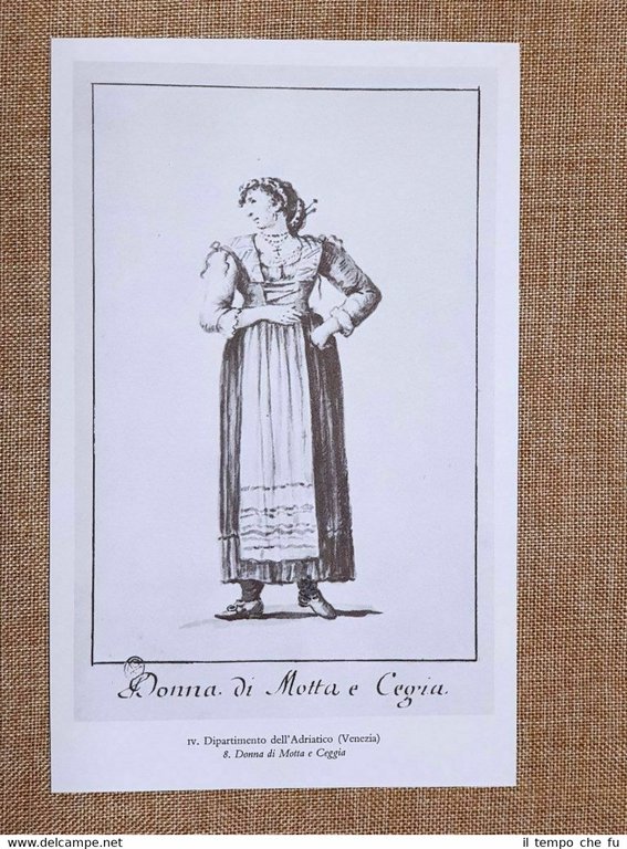 Rara stampa estratta da pubblicazione del 1973 Donna e Uomo di Motta e Ceggia Dipartimento dell'Adriatico Venezia Moda e costume del Regno Italico o d'Italia 1805-1814 Dimensioni fronte/retro: Cm 13,00 x 21,00 + Cm 13,00 x 21,00 Codice prodotto: II1897-039 Qualora vogliate delle scansioni migliori contattateci, soddisferemo ogni vostra richiesta. Il Regno d'Italia napoleonico, noto comunemente come Regno Italico, fu uno Stato fondato da Napoleone Bonaparte nel 1805, allorquando il generale francese si fece incoronare sovrano della previgente Repubblica Italiana. Il Regno, che comprendeva l'Italia centro orientale e buona parte del settentrione e aveva capitale Milano, non sopravvisse alla caduta del suo monarca, e si disciolse nel 1814. Il Regno napoleonico d'Italia o Regno Italico è considerato dalla storica anglo-italiana Jessie White l'embrione dello Stato unitario italiano costituitosi poi nel 1861. Paypal Carta di credito Bonifico bancario Accuratamente adagiate su un cartoncino e protette da pellicola trasparente rigida, il tutto viene inserito dentro plico di adeguate dimensioni per proteggerne l'integrità.