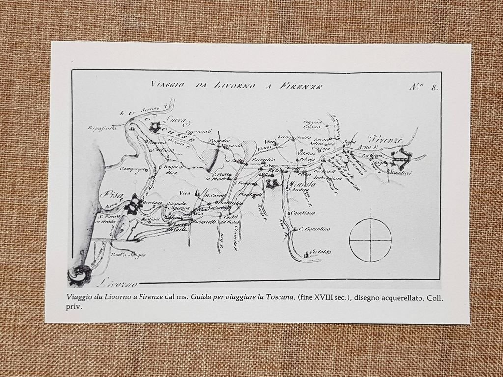 Rara stampa estratta da pubblicazione di fine ‘900 Opera grafica di G.C.?Martini che raffigura la Cattedrale di Santa Maria Assunta a Pisa, realizzata con tecnica a penna e acquerello e conservata presso l’Archivio di Stato di Livorno. Il disegno, probabilmente databile tra XIX e inizi XX secolo, restituisce con precisione architettonica e sensibilità cromatica la facciata romanico pisana, caratterizzata da marmi bicromi, logge sovrapposte e ricca decorazione scultorea. L’uso dell’acquerello ammorbidisce i volumi e conferisce profondità alla scena, mentre il tratto a penna definisce con chiarezza i dettagli costruttivi e ornamentali. L’opera ha valore sia documentario, come testimonianza dello stato del monumento in epoca storica, sia artistico, per la capacità di unire rigore descrittivo e resa atmosferica, offrendo uno sguardo d’autore su uno dei simboli più celebri dell’arte medievale italiana. E Tavola acquerellata di mano anonima, tratta dal manoscritto Guida per viaggiare la Toscana (fine Settecento), che illustra l’itinerario tra Livorno e Firenze attraverso una sequenza di località e punti di riferimento riportati con la grafia dell’epoca. Dimensioni fronte/retro: Cm 18,00 x 12,00 + Cm 18,00 x 12,00 Codice prodotto: X - 47 PayPal Carta di credito Bonifico bancario Inserita dentro plico di adeguate dimensioni per proteggerne l'integrità Spedizione con posta ordinaria o raccomandata scelta dall’Acquirente nel momento del pagamento Clicca qui per accedere al nostro Store ed al suo sterminato archivio