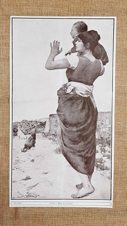 Rara stampa estratta da pubblicazione del 1932 Dipinto di E.?Ferroni che raffigura una scena di vita rurale ambientata sull’aia, dove alcune galline beccano a terra. In primo piano una donna a piedi nudi tiene tra le braccia una bambina piccola e, insieme, volgono lo sguardo verso un punto lontano, forse nell’attesa o all’avvistamento del capofamiglia. La composizione, semplice e diretta, trasmette un senso di intimità familiare e di quotidianità contadina, valorizzando i gesti e le espressioni come veicolo di emozione e racconto. L’ambientazione, resa con attenzione ai dettagli realistici, restituisce l’atmosfera autentica della vita di campagna. Dimensioni Cm 17,00 x 32,00 Codice prodotto: S.I. - 070 PayPal Carta di credito Bonifico bancario Inserita dentro plico di adeguate dimensioni per proteggerne l'integrità Spedizione con posta ordinaria o raccomandata scelta dall’Acquirente nel momento del pagamento Clicca qui per accedere al nostro Store ed al suo sterminato archivio
