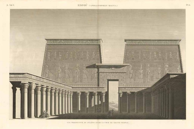 Edfou (Apollinopolis Magna) - Vue perspective du Pylone et de la cour du Grand Temple