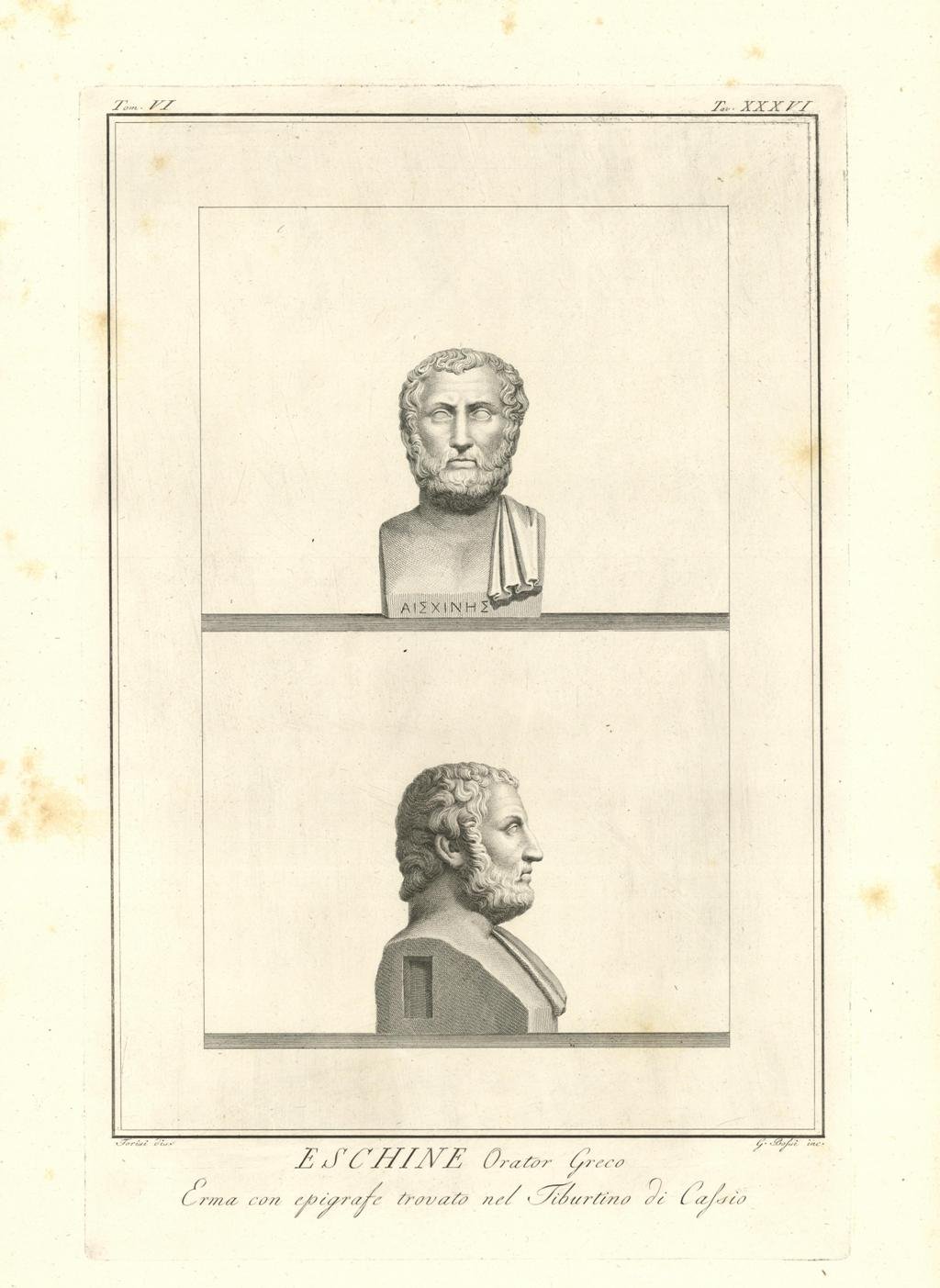 L’epigrafe sul busto prova che questo sia l’erma di Eschine, oratore greco e uomo politico vissuto attorno al 300 a.C. La sua condotta politica e la sua oratoria lo distinsero quale principale rivale di Demostene. Inserita nell'opera "Il Museo Pio-Clementino descritto da Ennio Quirino Visconti Direttore del Museo Capitolino - Tomo sesto - Dedicato alla Santita di Nostro Signore PIO SESTO Pontefice Massimo. Edito da Luigi Mirri / Mercante di quadri incontro il Palazzo Bernini. In Roma MDCCXCII con Privilegio Pontificio. Opera dedicata ai Busti del Museo Pio-Clementino. Leggeri segni di foxing