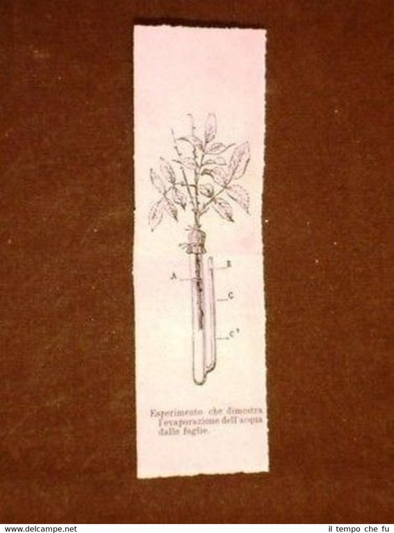 RARA INCISIONE OTTOCENTESCA ESTRATTA DA RIVISTA D'EPOCA Esperimento dimostra l'Evaporazione dell'acqua dalle foglie II1882-053T Dimensioni Cm 3,50 x 11,00 Qualora vogliate delle scansioni migliori contattateci, soddisferemo ogni vostra richiesta. Paypal Carta di credito Bonifico bancario Accuratamente adagiate su un cartoncino e protette da pellicola trasparente rigida il tutto viene inserito dentro plico di adeguate dimensioni per proteggerne l'integrità
