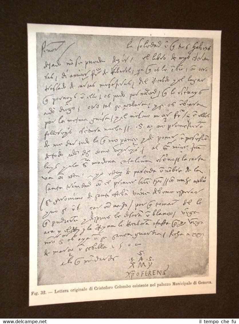 Rara Incisione Estratta da Rivista d'epoca di fine 1800 Fac simile di lettera di Cristoforo Colombo Esistente nel Palazzo municipale di Genova Ved-037 Dimensioni Cm 13,00 x 18,00 Qualora vogliate delle scansioni migliori contattateci, soddisferemo ogni vostra richiesta. PaypalCarta di creditoBonifico bancario Accuratamente adagiate su un cartoncino e protette da pellicola trasparente rigida,il tutto viene inserito dentro plico di adeguate dimensioni per proteggerne l'integrità.