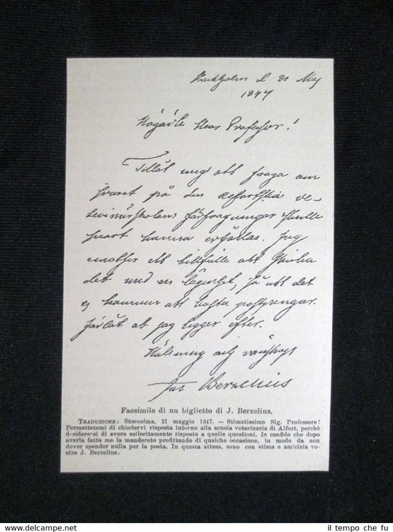 Rara stampa Estratta da introvabile e pregiata opera d'epoca dei primissimi del 1900 Fac simile di un biglietto del chimico svedese Jöns Jacob Berzelius Stoccolma, 21 maggio 1847 KXIX-028 Dimensioni Cm 10,00 x 15,00 Qualora vogliate delle scansioni migliori contattateci, soddisferemo ogni vostra richiesta. PaypalCarta di creditoBonifico bancario Accuratamente adagiate su un cartoncino e protette da pellicola trasparente rigida,il tutto viene inserito dentro plico di adeguate dimensioni per proteggerne l'integrità.