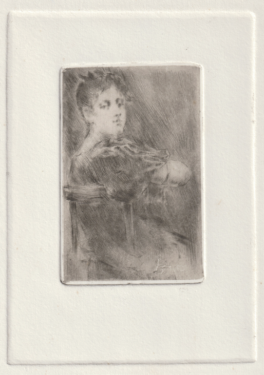 L'artista raffigura la moglie Eugenia Dal Co seduta col corpo di profilo e la testa di tre quarti volta verso l'osservatore. La lastra è lavorata con continui tratteggi irregolari trattati in modo da costruire i lineamenti del ritratto sfruttando il bianco della carta. Firma a monotipo in basso a destra. Esemplare nel II/II stato con l'aggiunta di tratti sulla parete dietro la figura. Del I stato si conosce un solo esemplare firmato e dedicato dall'autore alla moglie, oggi in collezione privata. Il soggetto è stampato con una seconda matrice vergine impressa a secco a mo di cornice.