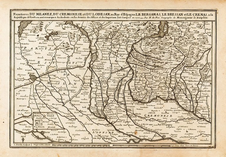 Frontieres du Milanez, du Cremonese et du Lodesan, au Roy d'Espagne. Le Bergamas, le Bressan et le Cremas a la Republique de Venise.
