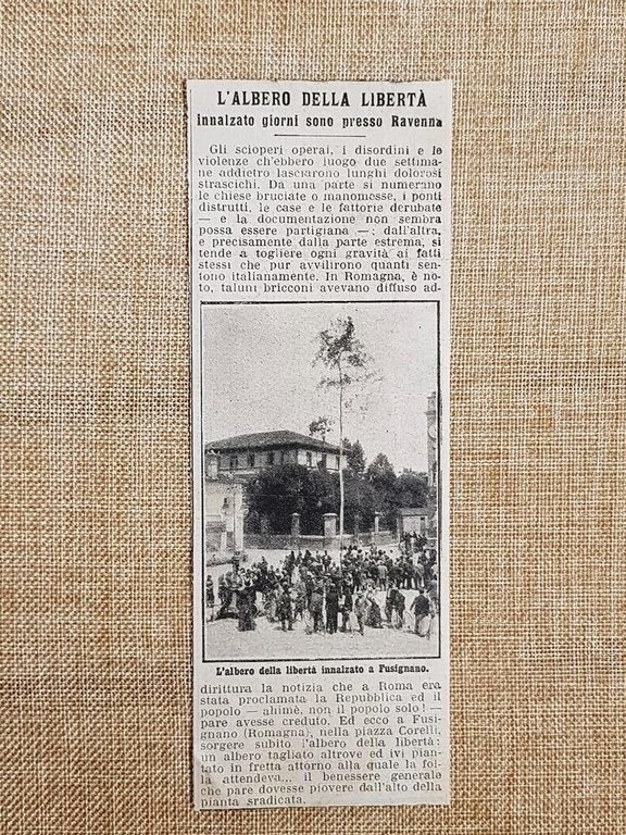 Fusignano nel 1914 Albero della libertà innalzato presso Ravenna Emilia Romagna Rara stampa estratta da pubblicazione del 1914 Fusignano nel 1914 Albero della libertà innalzato presso Ravenna Emilia Romagna Codice prodotto: VIP-175 Dimensioni Cm 17,00 x 6,00