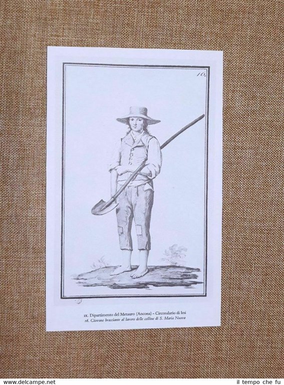 Rara stampa estratta da pubblicazione del 1973 Giovane bracciante al lavoro e Giovanotto alla moda ?Colline di S. Maria Nuova Circondario di Iesi ?Dipartimento del Metauro Ancona Moda e costume del Regno Italico o d'Italia 1805-1814 Dimensioni fronte/retro: Cm 13,00 x 21,00 + Cm 13,00 x 21,00 Codice prodotto: II1897-045 Qualora vogliate delle scansioni migliori contattateci, soddisferemo ogni vostra richiesta. Il Regno d'Italia napoleonico, noto comunemente come Regno Italico, fu uno Stato fondato da Napoleone Bonaparte nel 1805, allorquando il generale francese si fece incoronare sovrano della previgente Repubblica Italiana. Il Regno, che comprendeva l'Italia centro orientale e buona parte del settentrione e aveva capitale Milano, non sopravvisse alla caduta del suo monarca, e si disciolse nel 1814. Il Regno napoleonico d'Italia o Regno Italico è considerato dalla storica anglo-italiana Jessie White l'embrione dello Stato unitario italiano costituitosi poi nel 1861. Paypal Carta di credito Bonifico bancario Accuratamente adagiate su un cartoncino e protette da pellicola trasparente rigida, il tutto viene inserito dentro plico di adeguate dimensioni per proteggerne l'integrità.