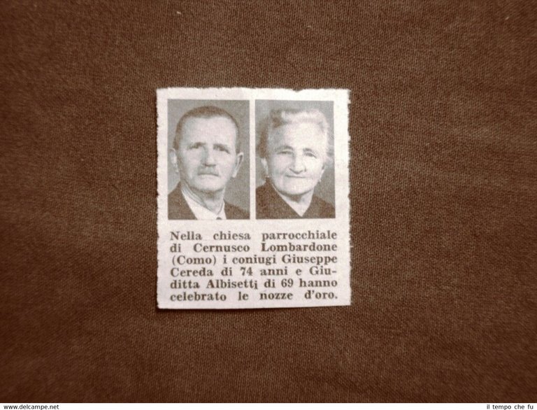 Rara stampa estratta da pubblicazione del 1958. .stampa che ha quindi oltre 60 anni! Giuseppe Cereda e Giuditta Albisetti di Cernusco Lombardone nel 1958 Nozze d'oro Como II1958-001 Dimensioni Cm 4,50 x 5,00 Qualora vogliate delle scansioni migliori contattateci, soddisferemo ogni vostra richiesta. Paypal Carta di credito Bonifico bancario Spedizione con posta prioritaria o raccomandata scelta dall'acquirente nel momento del pagamento