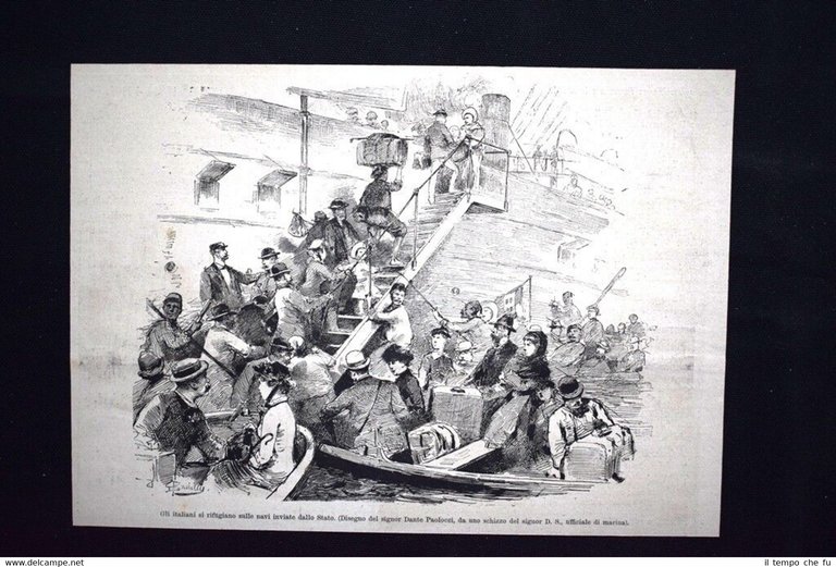 Gli Italiani si rifugiano sulle navi inviate dallo Stato Incisione del 1882