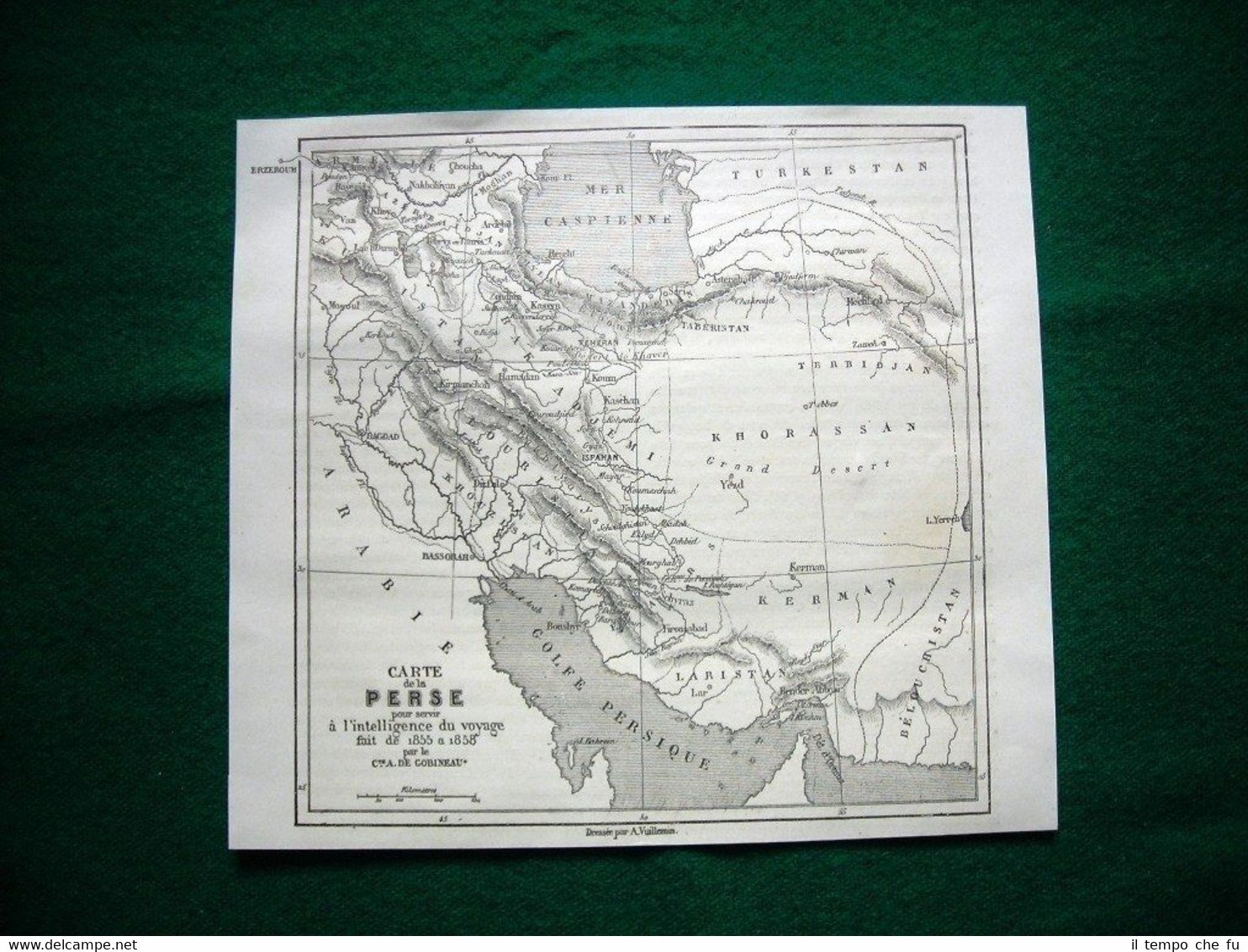 Rara Incisione Estratta da Rivista d'epoca del 1860 Gravure année 1860 carte de la Perse pour servir à l'intelligence du voyage fait de 1855 a 1858 TDM1860-010 Dimensioni Cm 19,00 x 17,00 Qualora vogliate delle scansioni migliori contattateci, soddisferemo ogni vostra richiesta. Paypal Carta di credito Bonifico bancario Accuratamente adagiate su un cartoncino e protette da pellicola trasparente rigida, il tutto viene inserito dentro plico di adeguate dimensioni per proteggerne l'integrità.