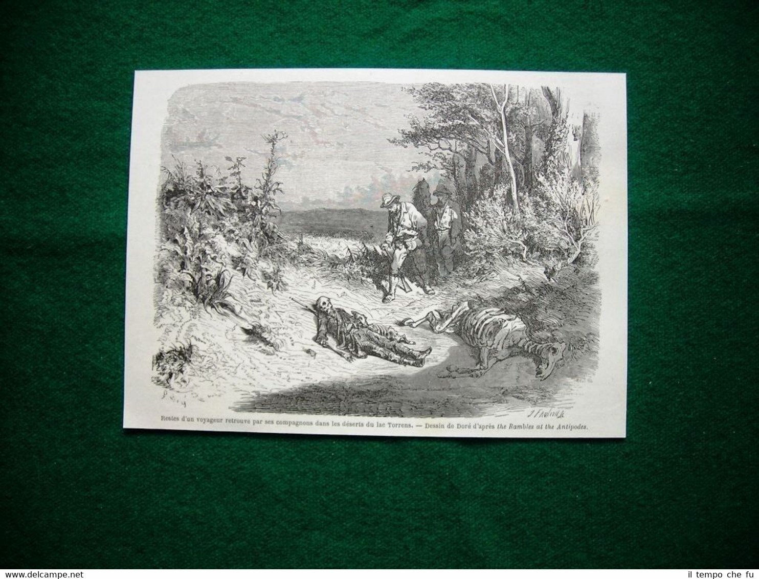 Gravure année 1860 restes d'un voyageur retrouve par ses compagnons