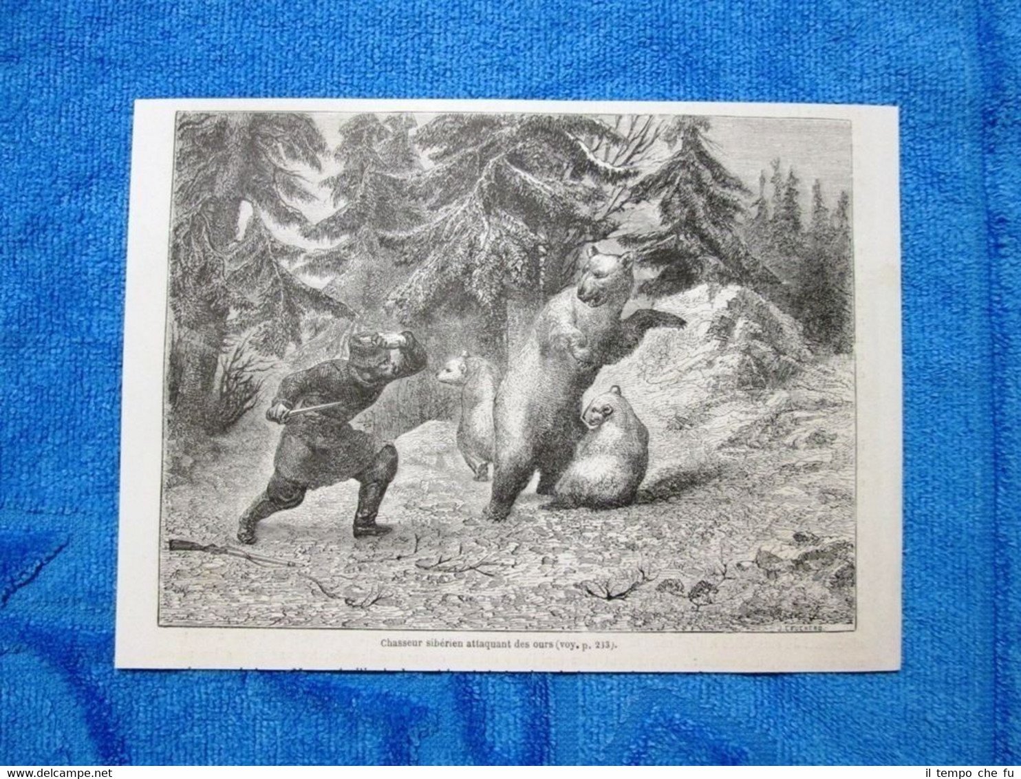 Gravure Année 1862 - Chasseur attaquant de ours - Cacciatore attacca l'orso