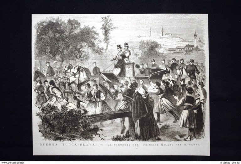 Guerra Turca-Slava -Partenza del Principe Milano per il campo Incisione del 1876