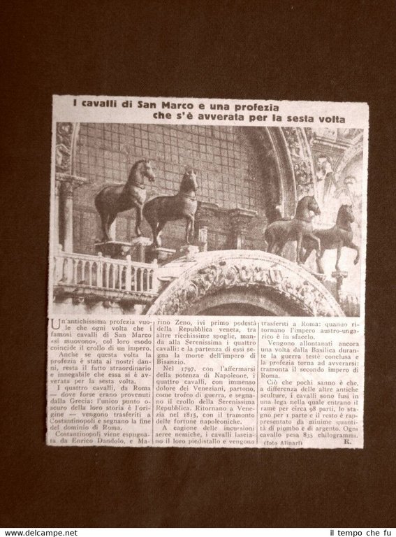 Rara stampa estratta da pubblicazione del 1945. .stampa che ha quindi oltre 72 anni! I cavalli di San Marco e la loro nefasta profezia che si avvera per la sesta volta II1945-001 Dimensioni Cm 13,00 x 14,00 Qualora vogliate delle scansioni migliori contattateci, soddisferemo ogni vostra richiesta. Paypal Carta di credito Bonifico bancario Accuratamente adagiate su un cartoncino e protette da pellicola trasparente rigida, il tutto viene inserito dentro plico di adeguate dimensioni per proteggerne l'integrità.