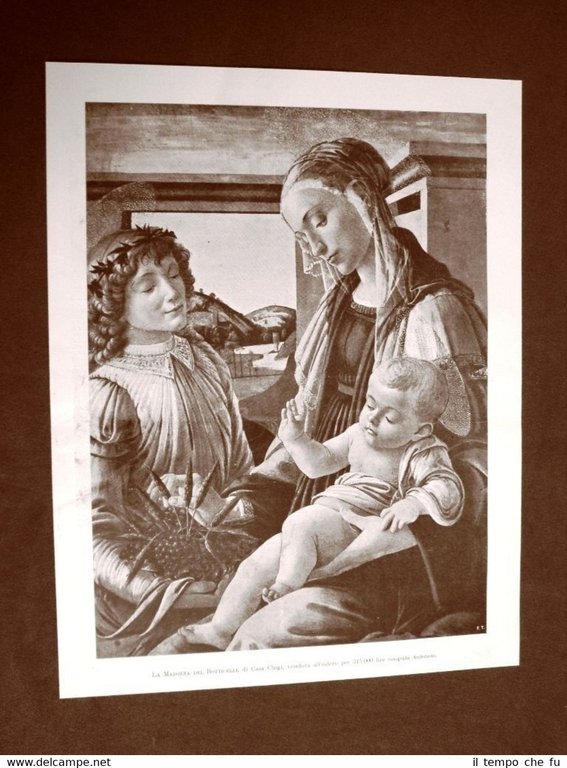 Rara stampa Estratta da Rivista d'epoca del 1899 . .stampa che ha quindi oltre 116 anni! III Esposizione d'arte in Venezia nel 1899 La Madonna del Botticelli Venduta all'estero per 315.000 £ire II1899-019 Dimensioni Cm 25,00 x 33,00 Qualora vogliate delle scansioni migliori contattateci, soddisferemo ogni vostra richiesta. PaypalCarta di creditoBonifico bancario Accuratamente adagiate su un cartoncino e protette da pellicola trasparente rigida,il tutto viene inserito dentro plico di adeguate dimensioni per proteggerne l'integrità.