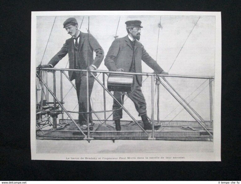 Rara stampa estratta da pubblicazione del 1902. .stampa che ha quindi oltre 116 anni! Il barone de Bradsky e l'ingegnere Paul Morin nella carlinga del loro aerostato Dimensioni Cm 23,00 x 18,00 Illustration 1902 - 06 Qualora vogliate delle scansioni migliori contattateci, soddisferemo ogni vostra richiesta. Paypal Carta di credito Bonifico bancario Accuratamente adagiate su un cartoncino e protette da pellicola trasparente rigida, il tutto viene inserito dentro plico di adeguate dimensioni per proteggerne l'integrità.