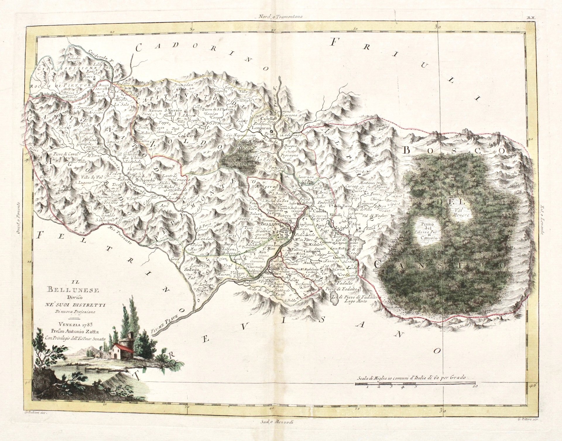 Incisione in rame, mm 325x420, colorata d’epoca. Tratta da “Atlante novissimo”. In basso a sin. piacevole cartiglio. Ottimo esemplare. Antonio Zatta (1775-1797) fu uno dei più importanti editori di carte geografiche del tardo XVIII secolo italiano. La sua opera costituisce un importante punto di passaggio tra la cartografia antica e moderna, più attenta all’accuratezza dei dettagli geografici che all’abbellimento estetico ricco di motivi mitologici o d’invenzione, come era quello dell’epoca precedente. La sua opera più importante è Atlante novissimo pubblicato tra il 1775 e il 1789; i disegni delle illustrazioni furono curate da collaboratori quali Giovanni Marco Pitteri, Anton Friedrich Busching, Pietro Antonio Novelli, ed incise da Giuliano Zuliani. Copper engraving, original color, mm 325x420, from “Atlante Novissimo”. Very good condition.