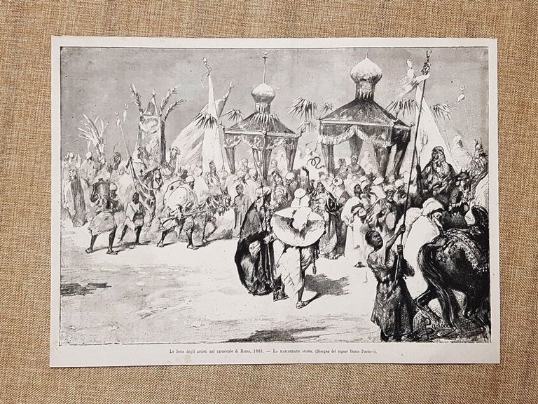 Il Carnevale di Roma nel 1881 Feste degli artisti La mascherata araba Paolocci Rara incisione estratta da pubblicazione del 1881 Il Carnevale di Roma nel 1881 Feste degli artisti La mascherata araba Disegno di Dante Paolocci Codice prodotto: II1881-041 Dimensioni: Cm 33,00 x 24,00