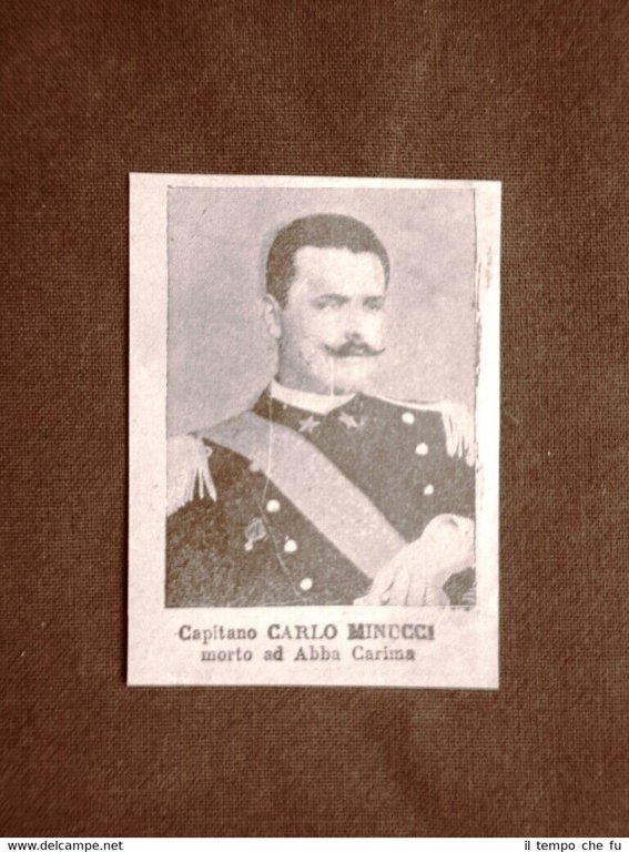 Rara stampa estratta da pubblicazione del 1896. .stampa che ha quindi oltre 123 anni! Il Colonialismo Italiano in Africa nel 1896 I nostri Ufficiali Carlo Minucci II1896-027 Dimensioni Cm 5,00 x 7,00 Qualora vogliate delle scansioni migliori contattateci, soddisferemo ogni vostra richiesta. Paypal Carta di credito Bonifico bancario Spedizione con posta ordinaria o raccomandata scelta dall'acquirente nel momento del pagamento