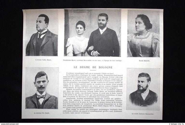 Rara stampa estratta da pubblicazione del 1902. .stampa che ha quindi oltre 116 anni! Il dramma di Bologna, in Italia L'avvocato Tullio Murri Teodolinda Murri, contessa Bonmartini e suo marito, il conte Antonio Bonmartini, all'epoca del loro matrimonio Rosita Bonetti Il dottor Pio Naldi Il conte Antonio Bonmartini, assassinato nel settembre 1902 Dimensioni Cm 23,00 x 18,00 Illustration 1902 - 25 Qualora vogliate delle scansioni migliori contattateci, soddisferemo ogni vostra richiesta. Paypal Carta di credito Bonifico bancario Accuratamente adagiate su un cartoncino e protette da pellicola trasparente rigida, il tutto viene inserito dentro plico di adeguate dimensioni per proteggerne l'integrità.