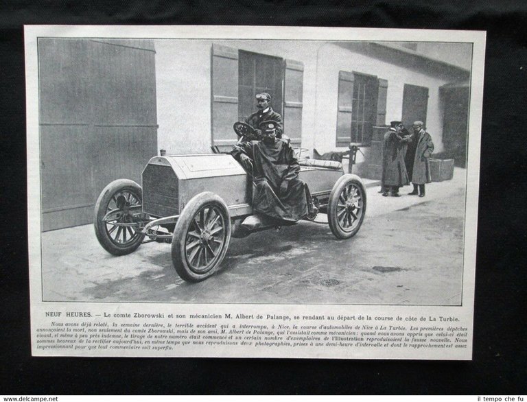 Rara stampa estratta da pubblicazione del 1903 .stampa che ha quindi oltre 115 anni! Nove Il conte Zborowski e il suo meccanico Albert de Palange, si recano alla partenza della corsa de La Turbie Dimensioni Cm 23,00 x 17,00 Illustration 1903 - 007 Qualora vogliate delle scansioni migliori contattateci, soddisferemo ogni vostra richiesta. Paypal Carta di credito Bonifico bancario Accuratamente adagiate su un cartoncino e protette da pellicola trasparente rigida, il tutto viene inserito dentro plico di adeguate dimensioni per proteggerne l'integrità.