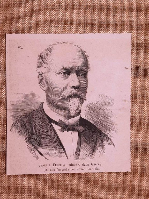Il Generale Emilio Maurizio Ferrero nel 1881 Cuneo, 1819 Firenze, 1887 Ministro Rara stampa estratta da pubblicazione del 1881 Il Generale Emilio Maurizio Ferrero nel 1881 Cuneo, 1819 Firenze, 1887 Ministro della guerra Codice prodotto: II1881-033 Dimensioni: Cm 11,00 x 13,00