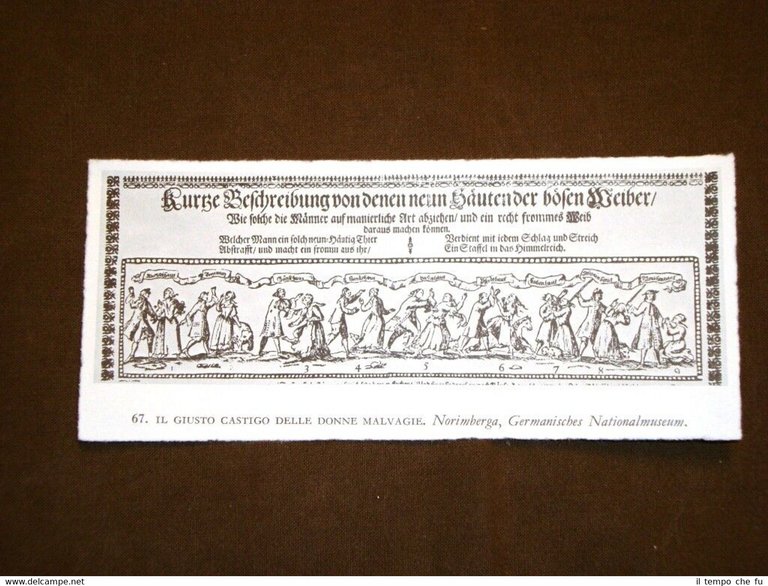 Stampa estratta da pubblicazione di metà '900 Il giusto castigo delle donne malvagie Norimberga Arte popolare tedesca Germania STAPO-011 Dimensioni Cm 17,00 x 7,00 Qualora vogliate delle scansioni migliori contattateci, soddisferemo ogni vostra richiesta. Paypal Carta di credito Bonifico bancario Accuratamente adagiate su un cartoncino e protette da pellicola trasparente rigida, il tutto viene inserito dentro plico di adeguate dimensioni per proteggerne l'integrità.