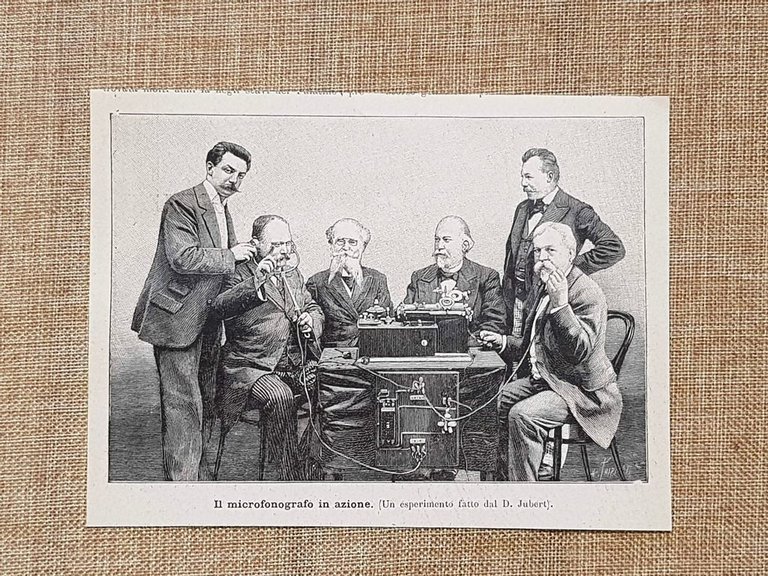 Il microfonografo Esperimento di D. Jubert del 1898 Invenzione Rara stampa estratta da pubblicazione del 1898 Il microfonografo Esperimento di D. Jubert del 1898 Invenzione Codice prodotto: NEDA 1898-086 Dimensioni: Cm 16,00 x 12,00