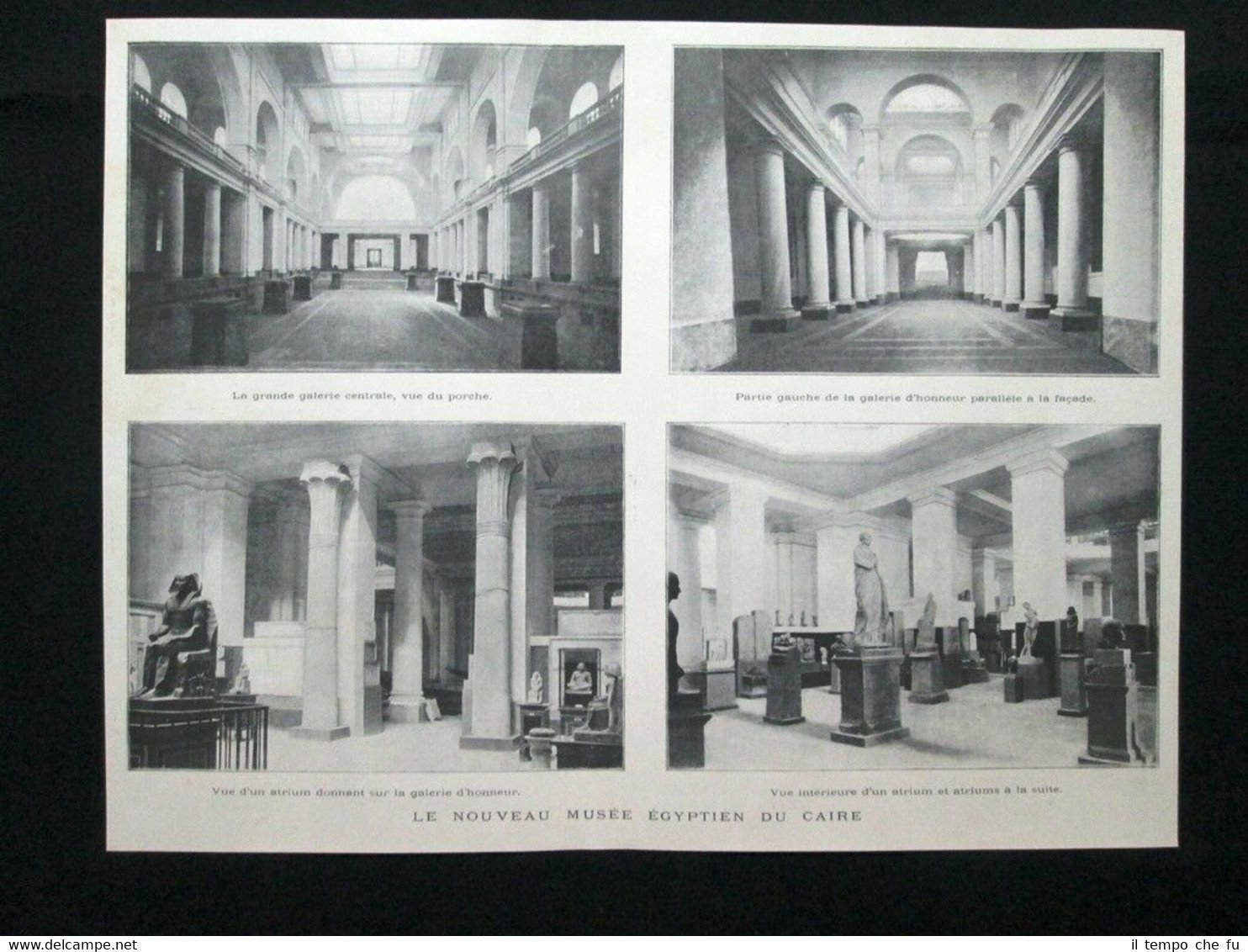 Rara stampa estratta da pubblicazione del 1902. .stampa che ha quindi oltre 116 anni! Il Nuovo Museo Egizio del Cairo, in Egitto La grande galleria centrale, vista dal portico Lato sinistro della galleria d'onore parallelo alla facciata Veduta di un atrio sulla galleria d'onore Veduta interna di un atrio e atri in adiacenza Dimensioni Cm 33,00 x 25,00 Illustration 1902 - 04 Qualora vogliate delle scansioni migliori contattateci, soddisferemo ogni vostra richiesta. Paypal Carta di credito Bonifico bancario Accuratamente adagiate su un cartoncino e protette da pellicola trasparente rigida, il tutto viene inserito dentro plico di adeguate dimensioni per proteggerne l'integrità.