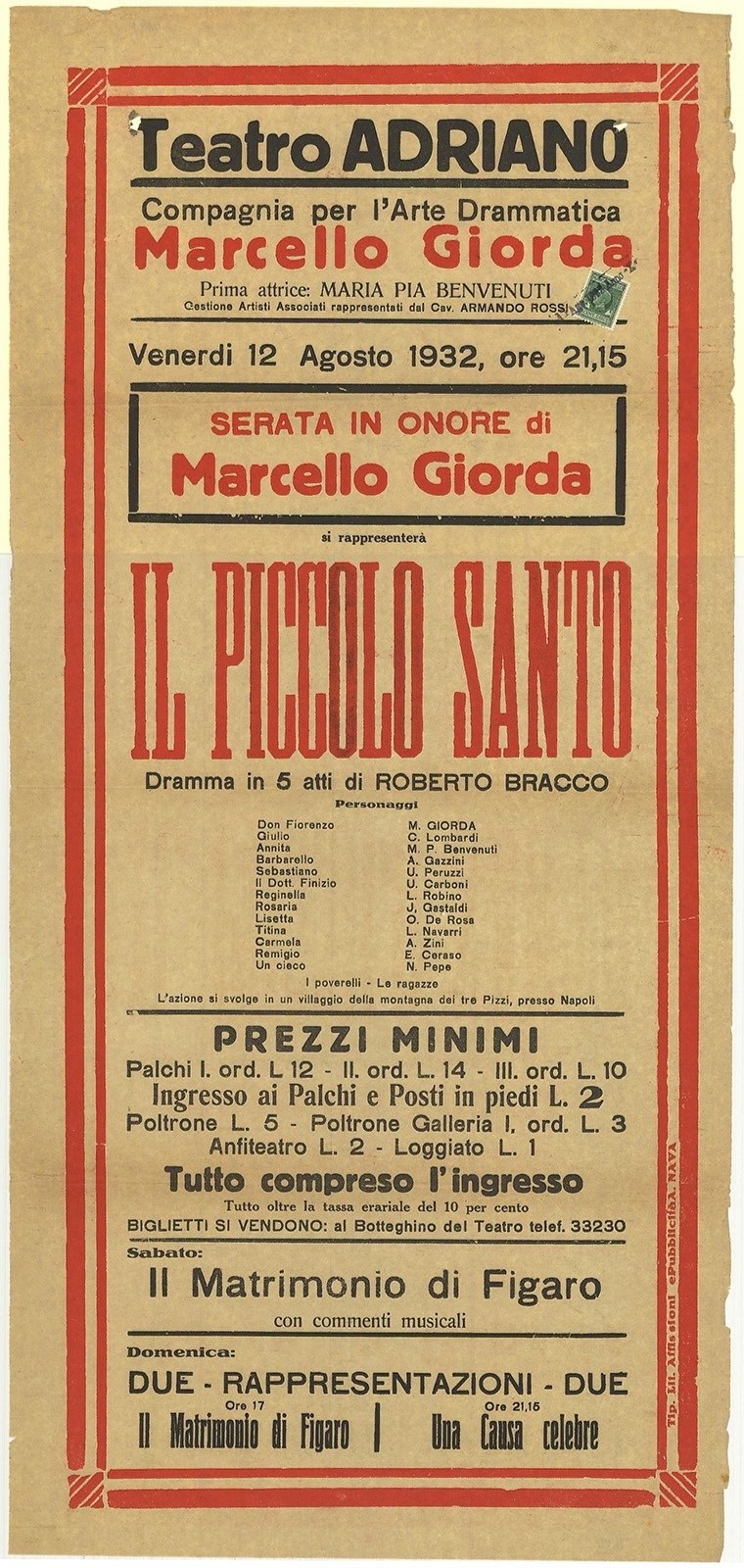 Compagnia per l'Arte Drammatica Marcello Giorda. Prima attrice Maria Pia Benvenuti. Tip. Lit. Nava e C. - Roma. Locandina ripiegata più volte con piccoli strappi. Marca da bollo applicata